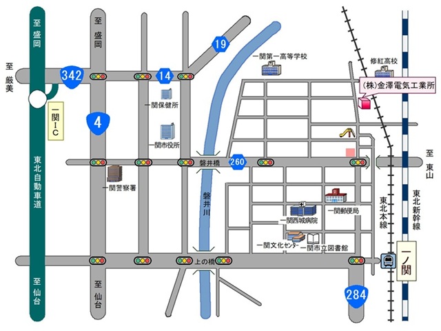 周辺地図 株式会社金澤電気工業所 本社 〒021-0891 岩手県一関市桜木町6番12号 TEL.0191-23-5200 FAX.0191-23-5201 盛岡支店 〒020-0864 岩手県盛岡市西仙北1丁目19番46号 TEL.019-636-1757 FAX.019-656-5166